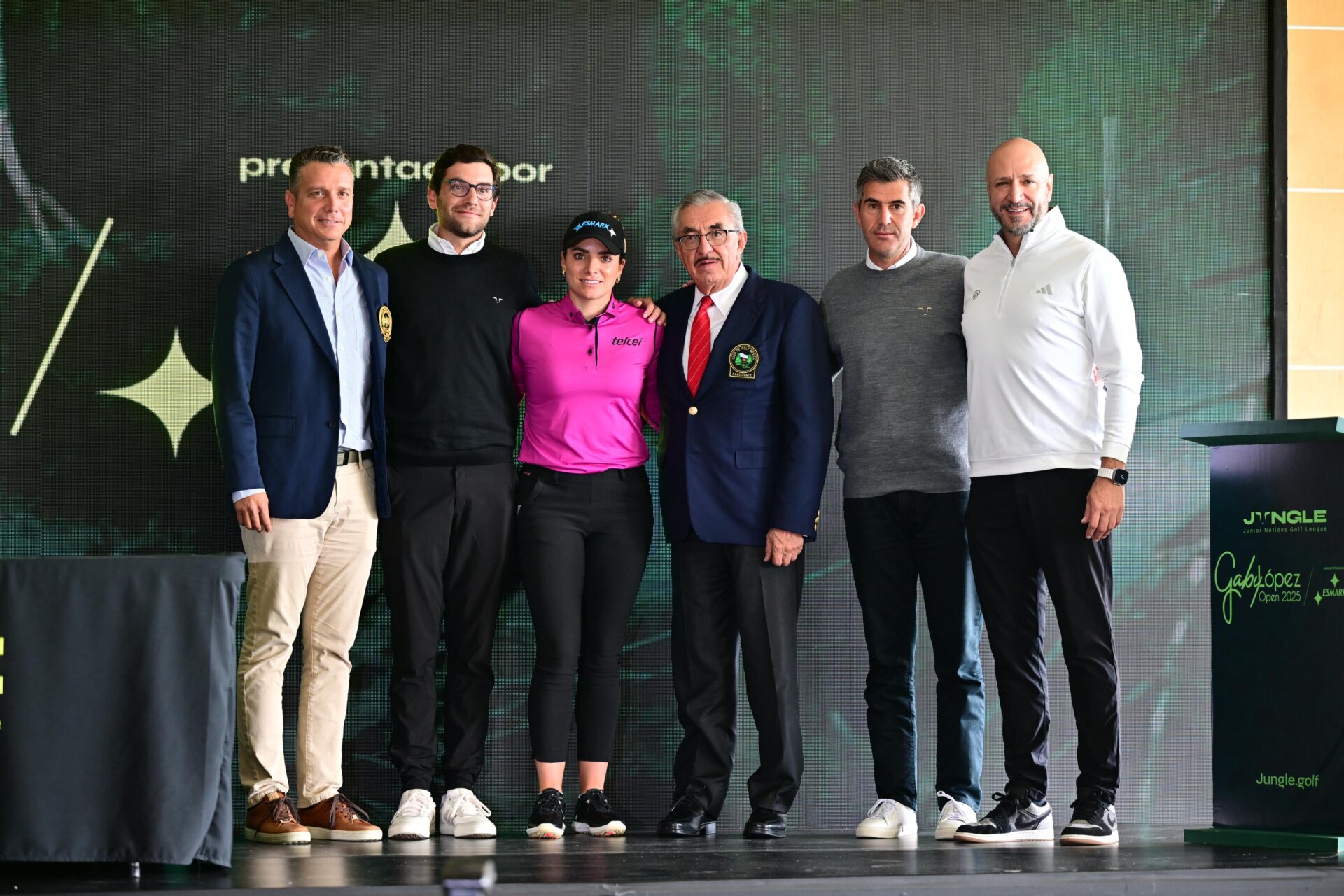 Eric Aguirre Palencia, presidente del Comité Nacional Infantil-Juvenil de la FMG; José López Butrón, director del Gaby López Open; Gaby López; Ignacio Ruiz, presidente del Consejo de Administración del Club de Golf México; Santiago Casado, fundador y presidente de JUNGLE, y Rodrigo Suárez Gilly, director de Azteca Golf.