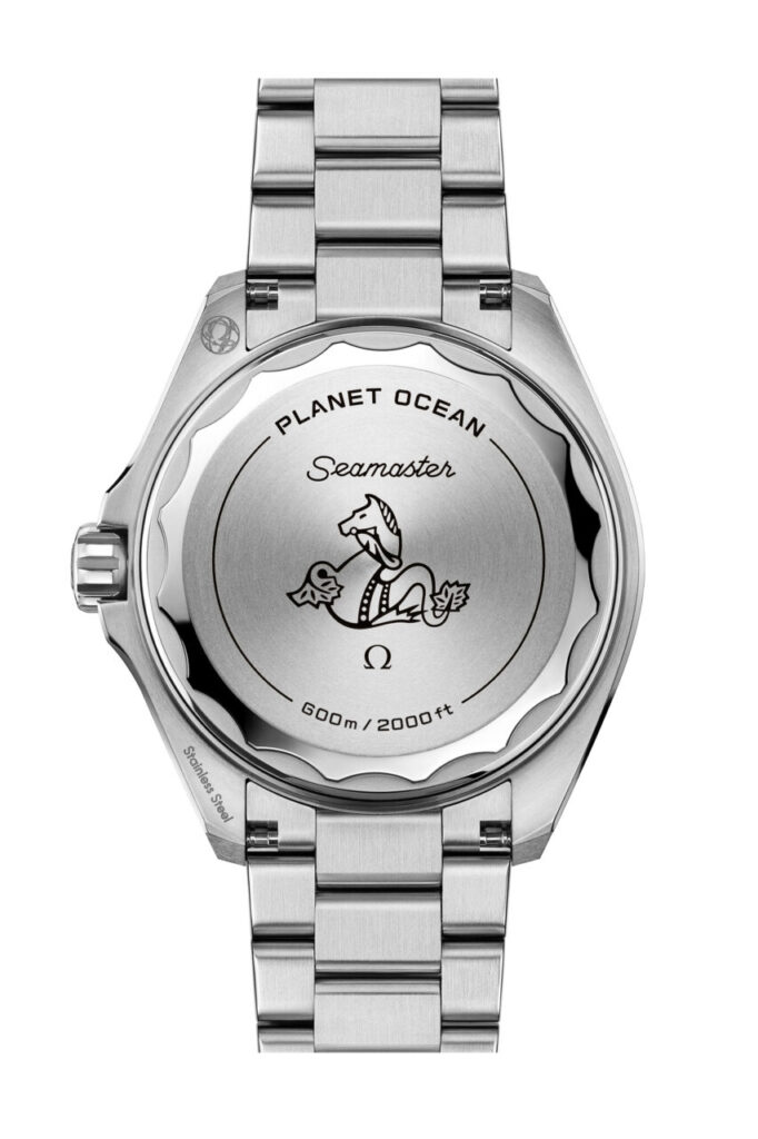 En lugar de cristal de zafiro, los nuevos relojes Planet Ocean incorporan fondos de caja atornillados fabricados en titanio de grado 5. Esto ha contribuido a refinar las dimensiones del reloj, reduciendo su peso y aumentando su resistencia. El diseño del fondo de caja presenta un borde ondulado, junto con las inscripciones PLANET OCEAN y SEAMASTER, una mención a la resistencia al agua y el icónico emblema del caballito de mar de OMEGA grabado en el centro.