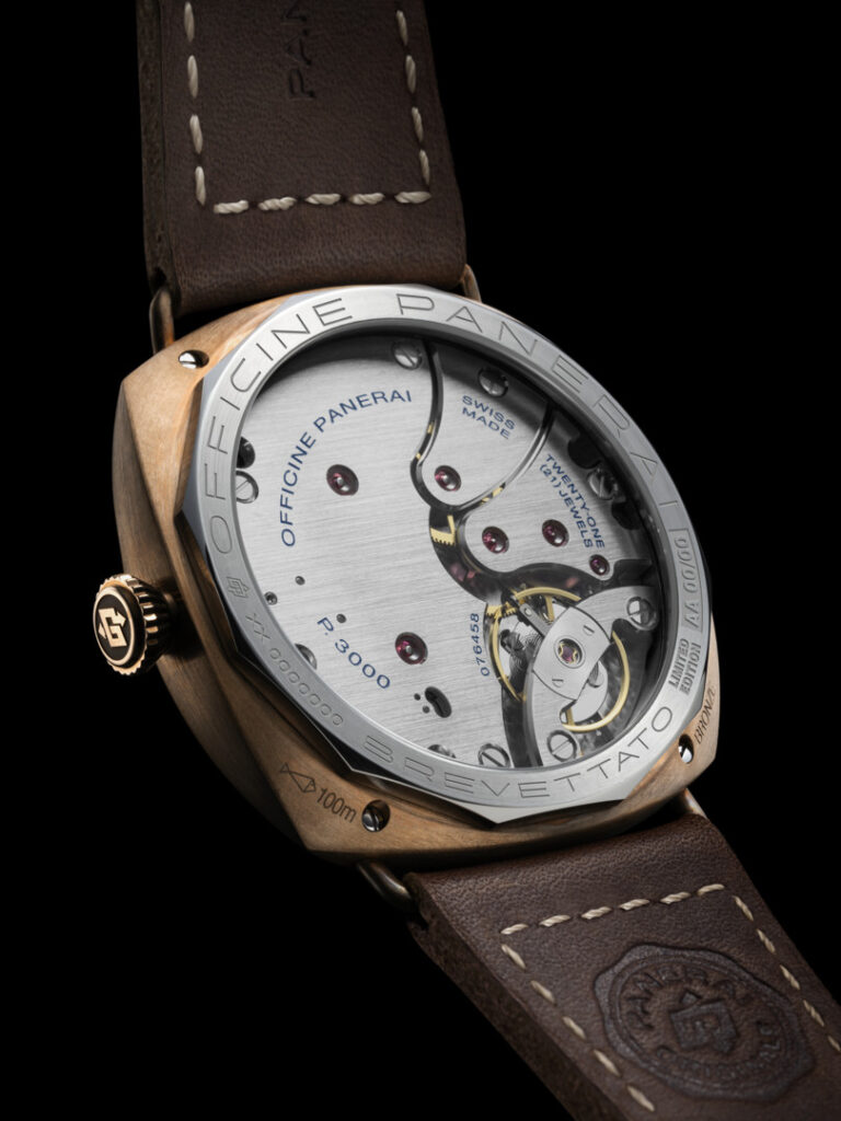 La SuperLumiNova beige añade un toque vintage y garantiza una visibilidad óptima con poca luz, emitiendo un brillo verde en la oscuridad. El fondo de caja abierto de titanio incorpora un cristal de zafiro, que ofrece una visión privilegiada del corazón del reloj: el calibre P.3000, desarrollado en la Manufactura de Panerai en Neuchâtel, Suiza. El aspecto del PAM01729 se complementa con una correa de piel enrollada de color marrón oscuro, con una construcción vintage plana y discreta, y una hebilla de bronce con forma trapezoidal, que recuerda a los históricos relojes Panerai cubiertos por el secreto militar.
