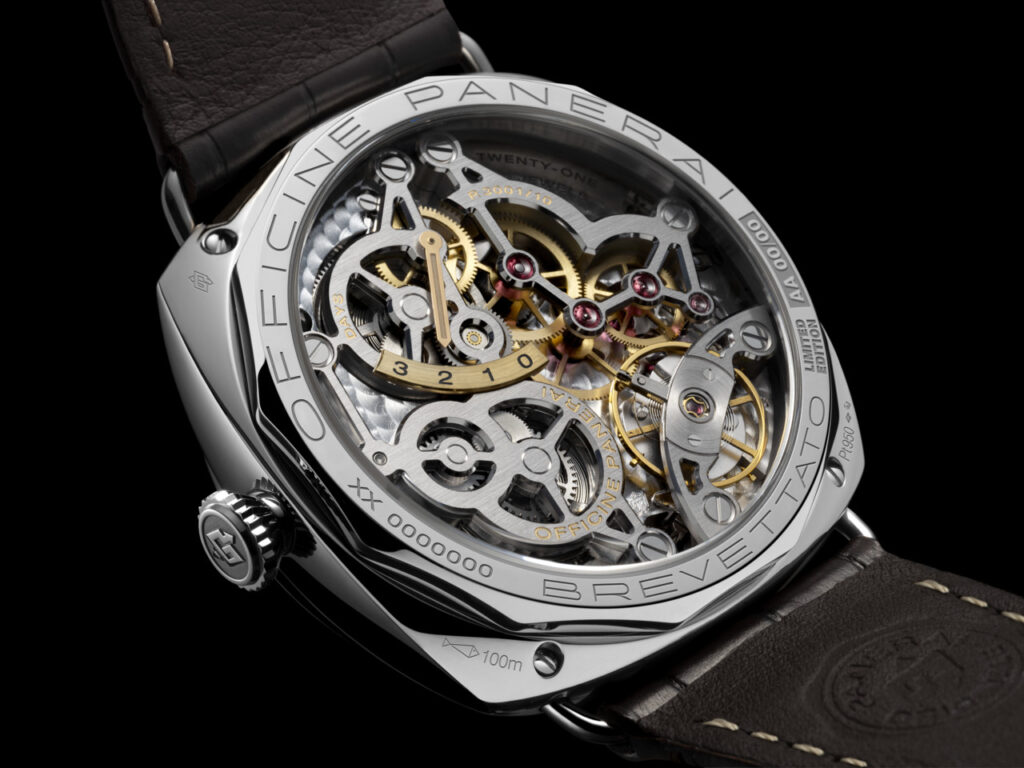 El Radiomir Viaggio nel Tempo Experience PAM01730 incorpora una aleación especial de platino puro al 95 %, que ofrece una dureza en un 85% superior a la del platino estándar gracias a un tratamiento exclusivo. Este material, que ofrece una mayor resistencia a los arañazos, pesa un 33% más que el oro de 18 quilates, lo que confiere al nuevo reloj un peso notable.